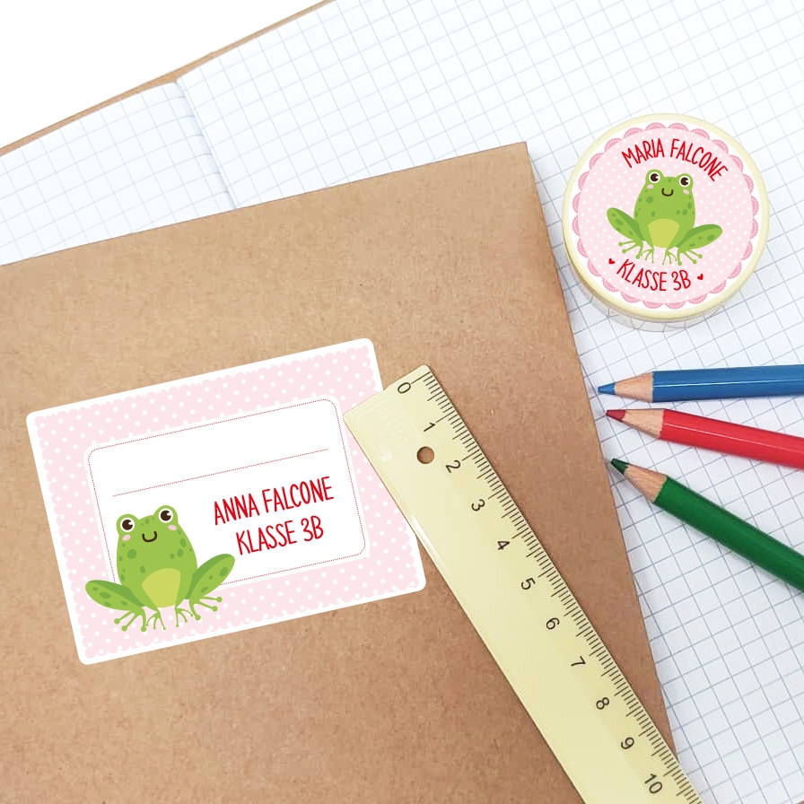 Quak, quak, quak! Dieser freundliche Frosch ziert unsere individuell bedruckten Heftaufkleber und erfreut die kleinen Tierfreunde.