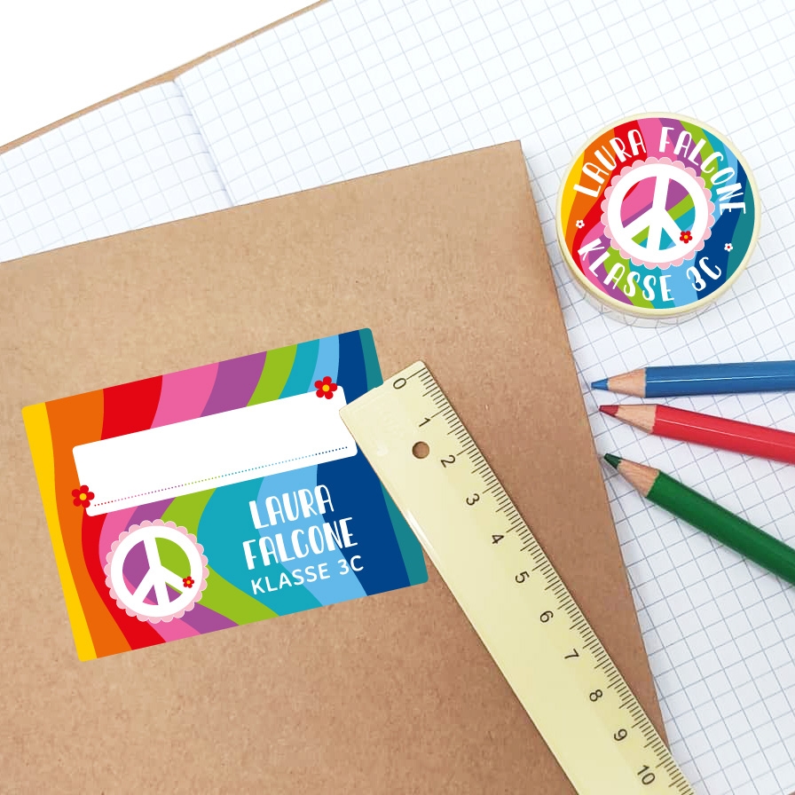Make peace not war! Die individuell bedruckten Schulaufkleber gibts hier im Hippie style mit Regenbogen und Peace Zeichen