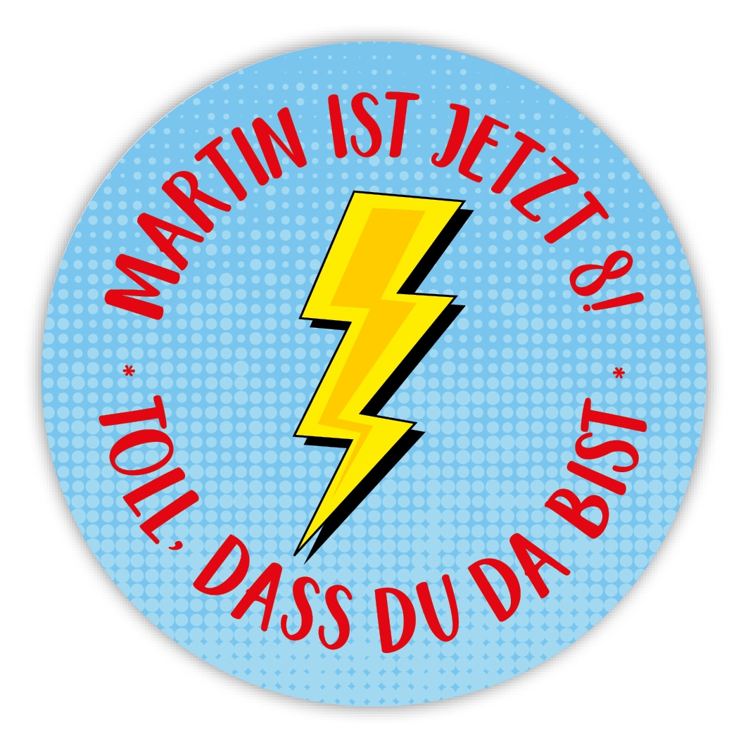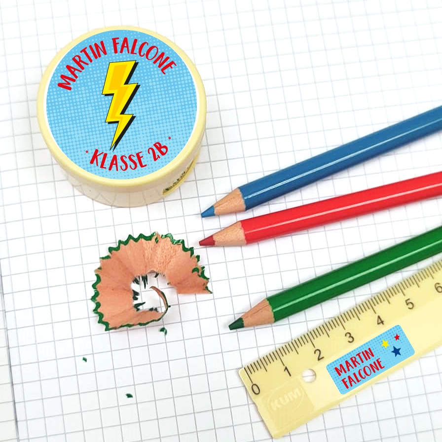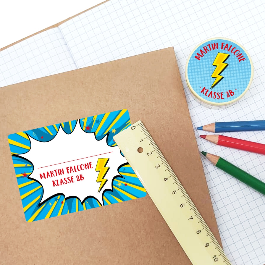 Runde Namensaufkleber im bunten comic Stil sowie gut leserlicher Schrift für kleine und große Schulkinder.